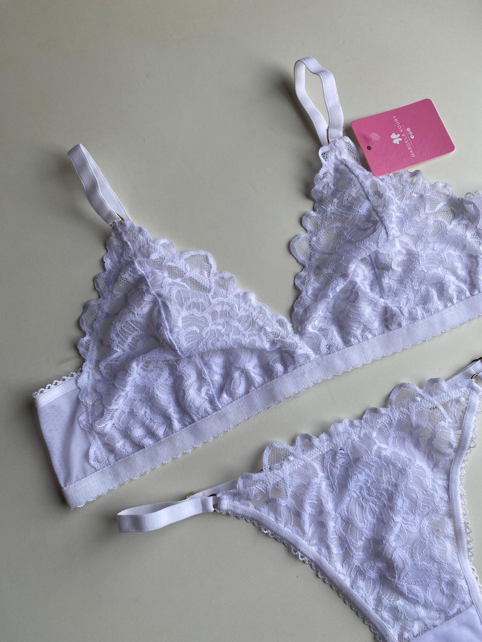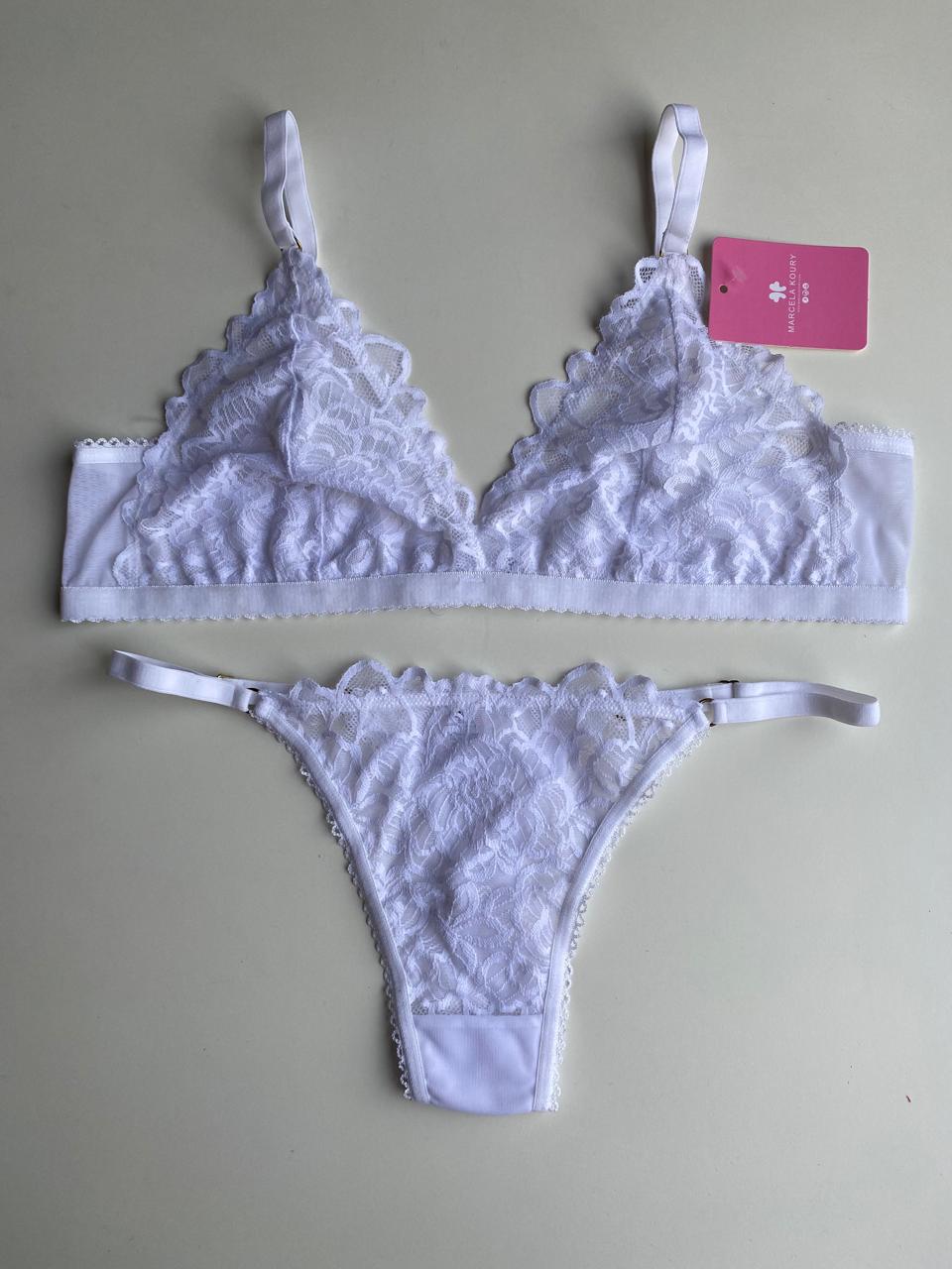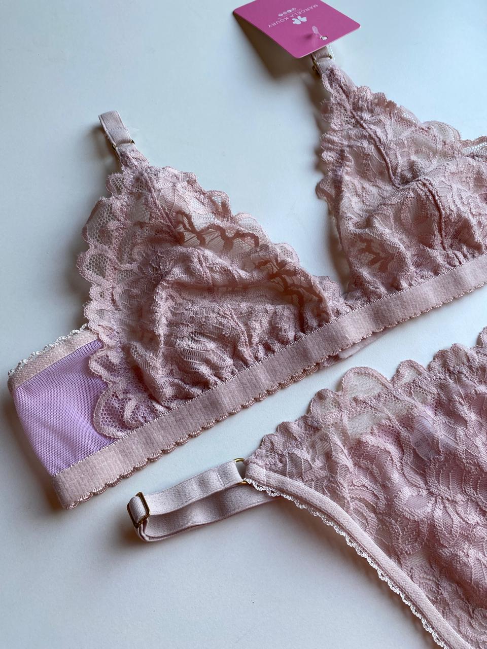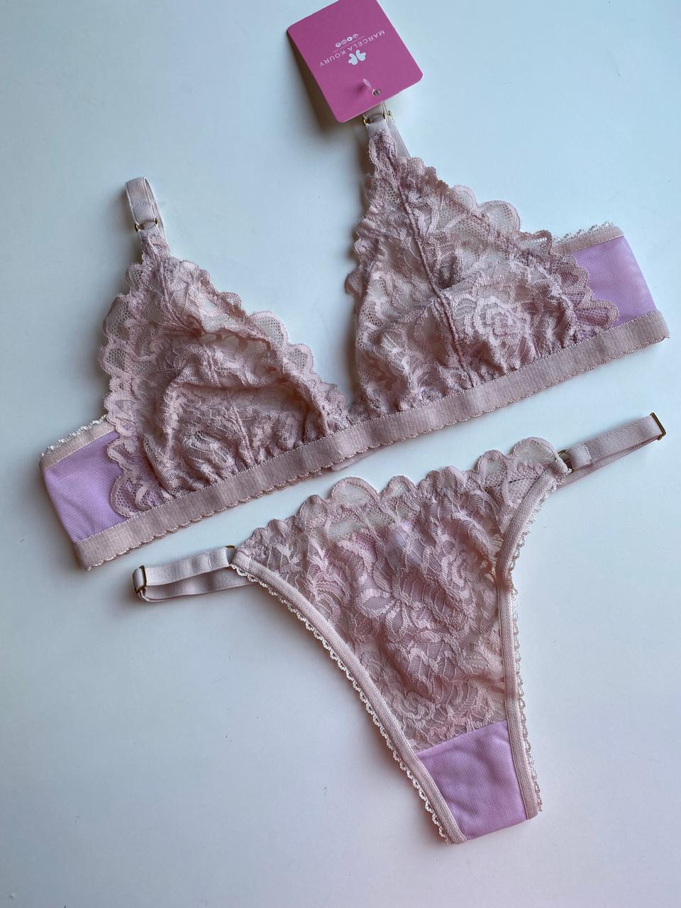 Delicadeza en cada detalle. Este conjunto combina un bralette suave, sin aro ni relleno, confeccionado en encaje y tul semitransparente que realza la silueta con un toque sensual y elegante. Su calce liviano ofrece libertad de movimiento y comodidad durante todo el día. La bombacha a tono completa el look con el mismo juego de transparencias y texturas, ideal para sentirte femenina, libre y con estilo.