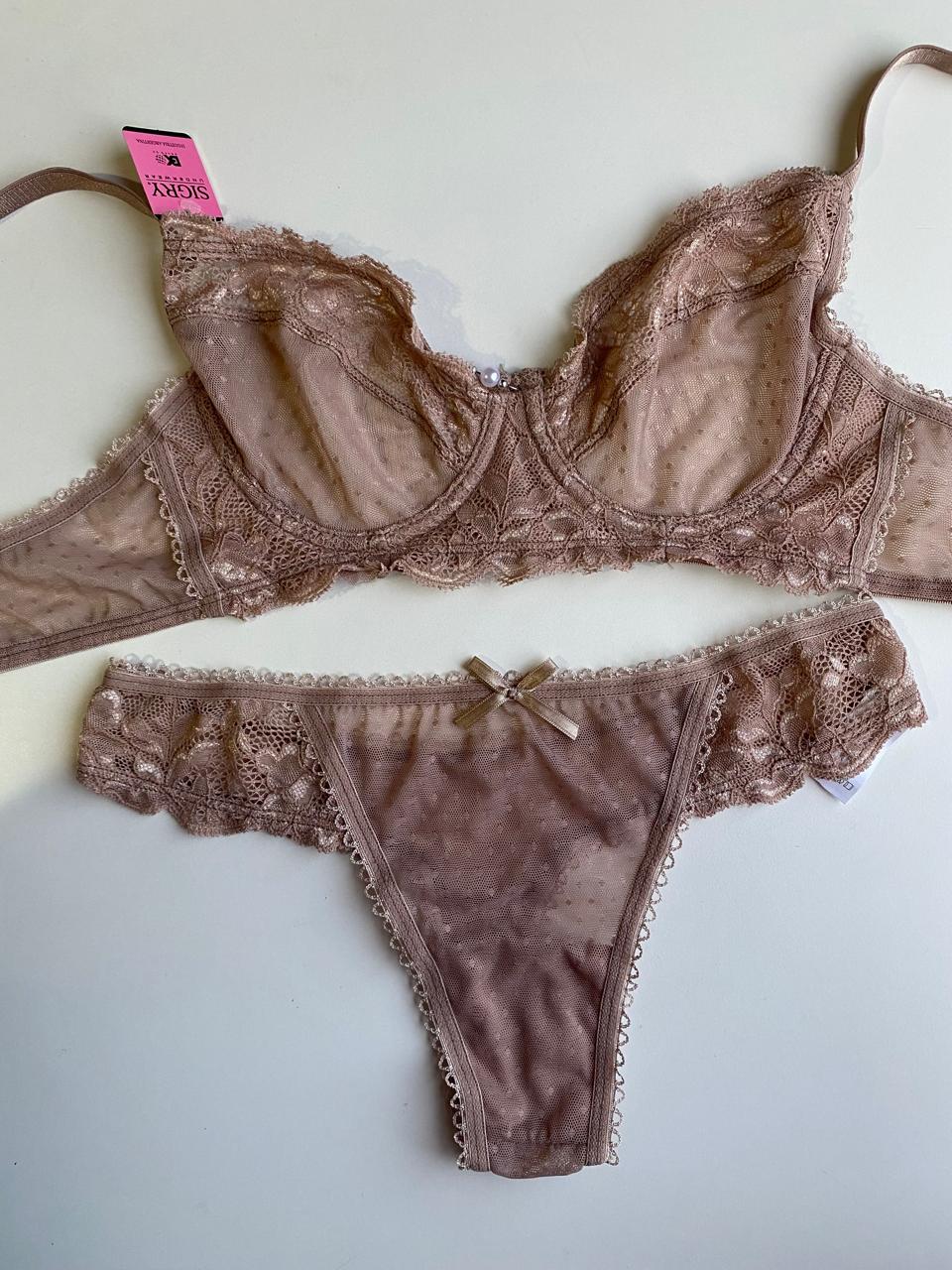 Un clásico renovado con todo el encanto del encaje. Este conjunto está confeccionado en tul bordado y encaje floral en tono nougat, con corpiño con aro que brinda contención sin perder delicadeza. Los detalles de puntilla y el moñito con perla en el centro del busto y la bombacha agregan un toque romántico y sofisticado. Ideal para ocasiones especiales o para sentirte única en tu día a día.